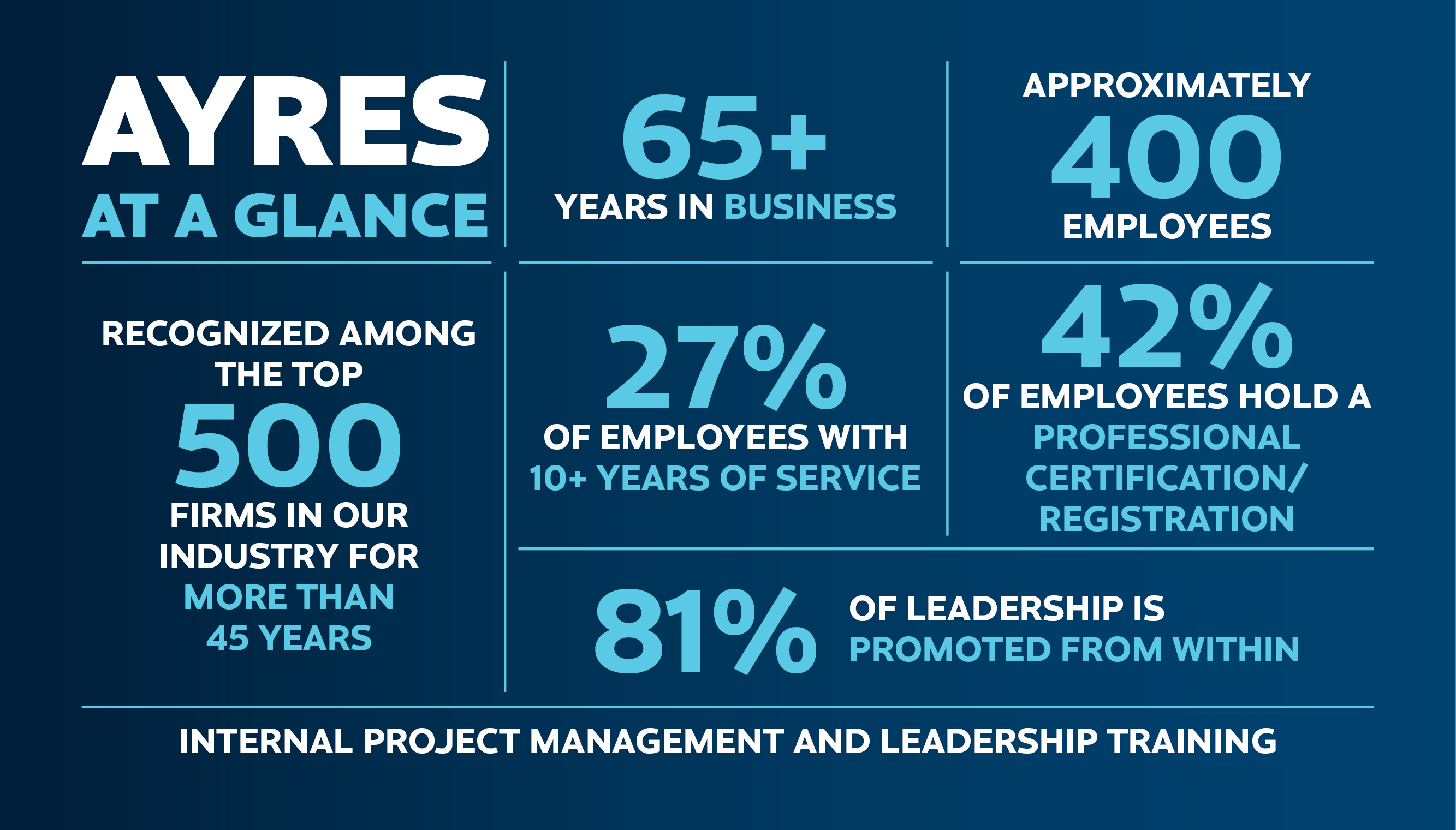 Our culture is open, and our leadership is transparent – paving the way for growth, new challenges, and the occasional mistake that we can learn from and better ourselves by. We’re all on different paths – professionally and personally. Ayres meets us where we’re at and empowers us with the tools and resources to grow our career and find passion and purpose in our work.